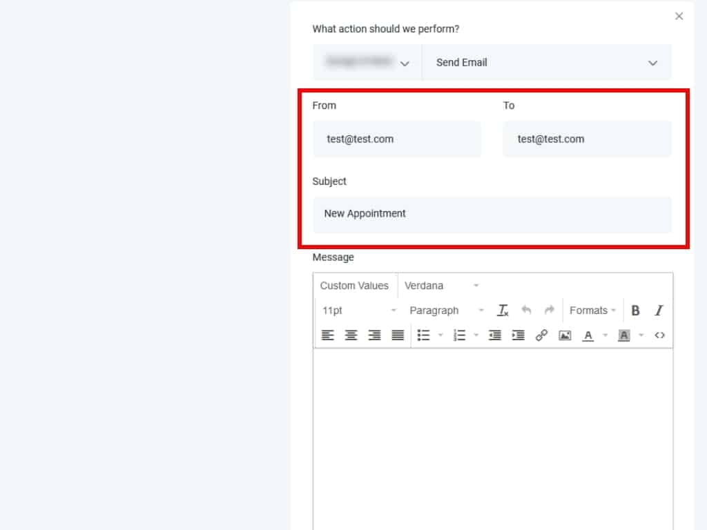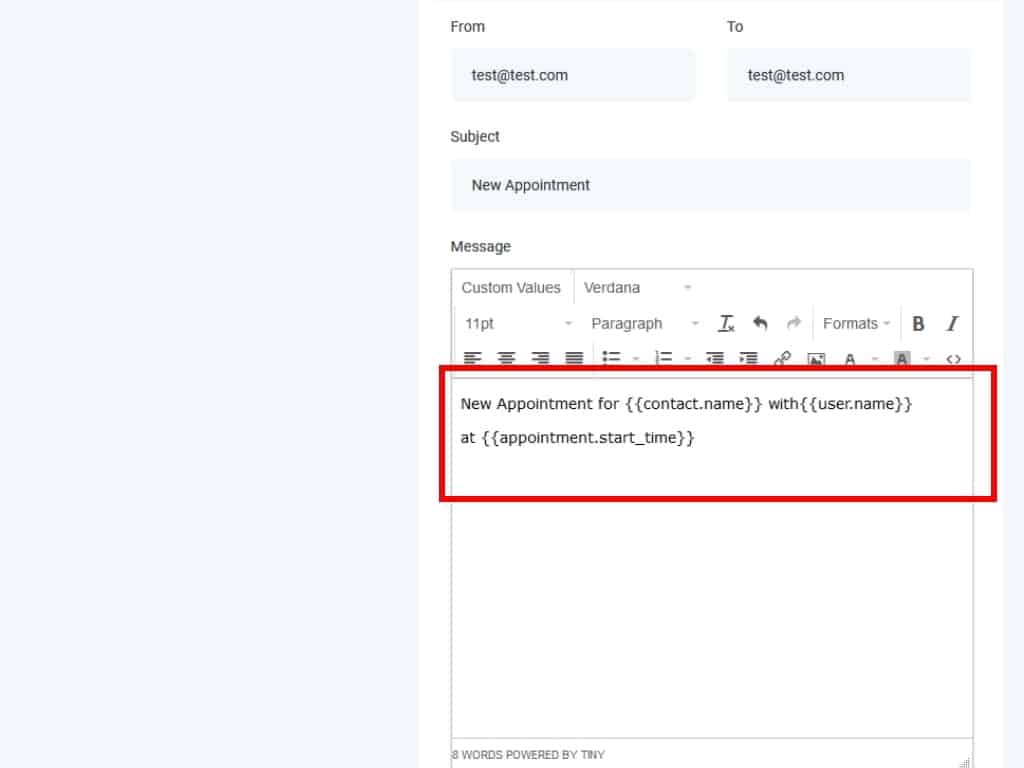 To write the text of the message, you can combine normal text and custom values, such as contact full name and appointment start date.