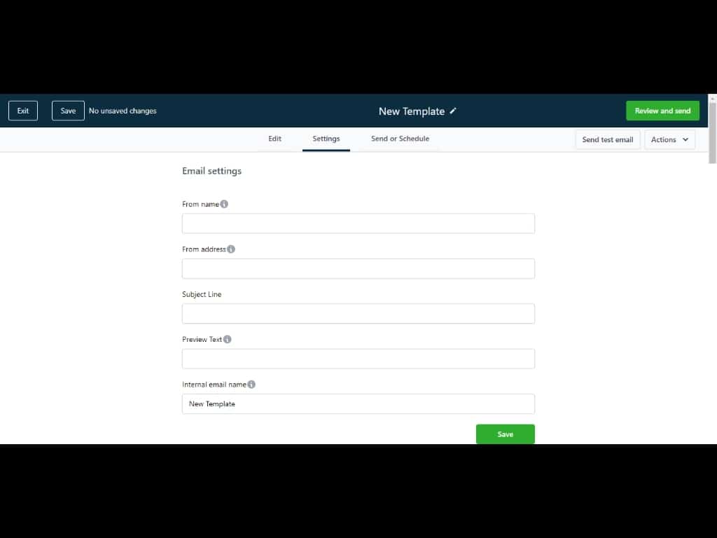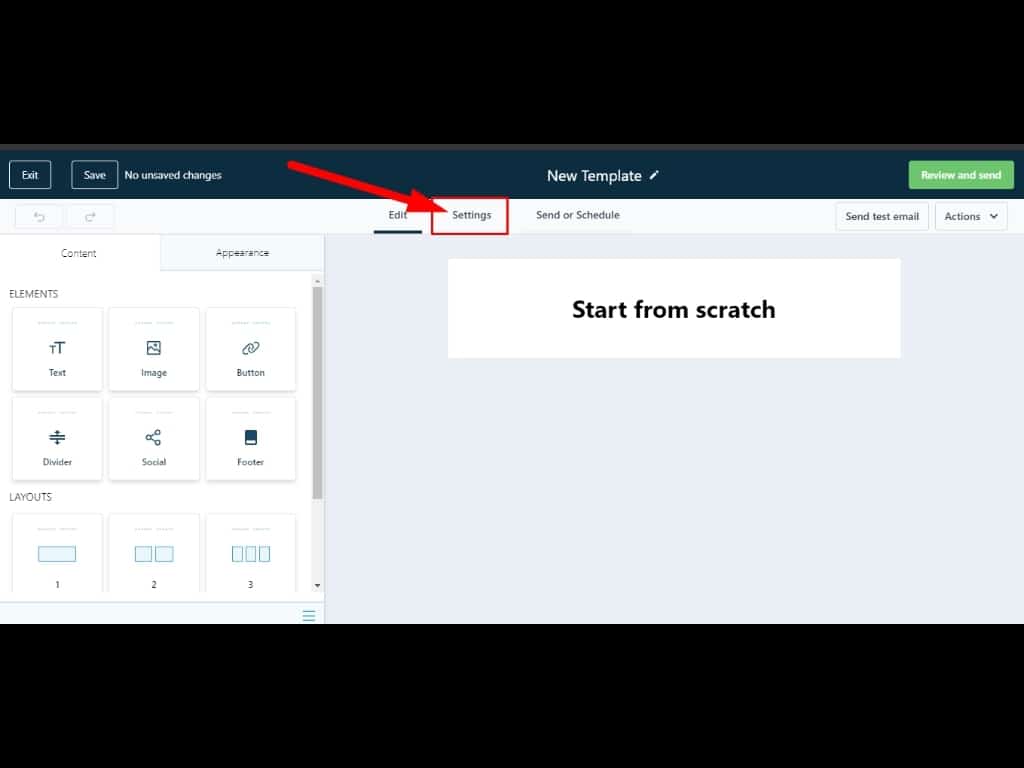 This opens your email builder. But before we get started with a blank template, let’s click the Settings tab to set up some basic information for the email.