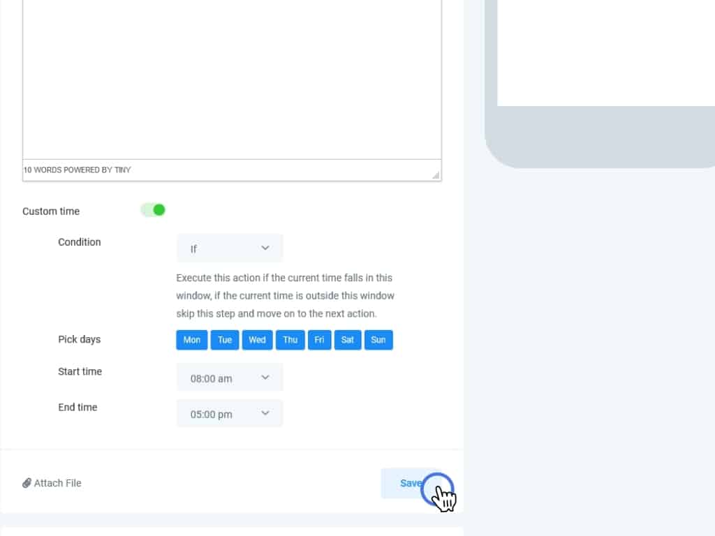 As before, you can also set If, When, and Exact conditionals in the custom time area and attach files to your email.