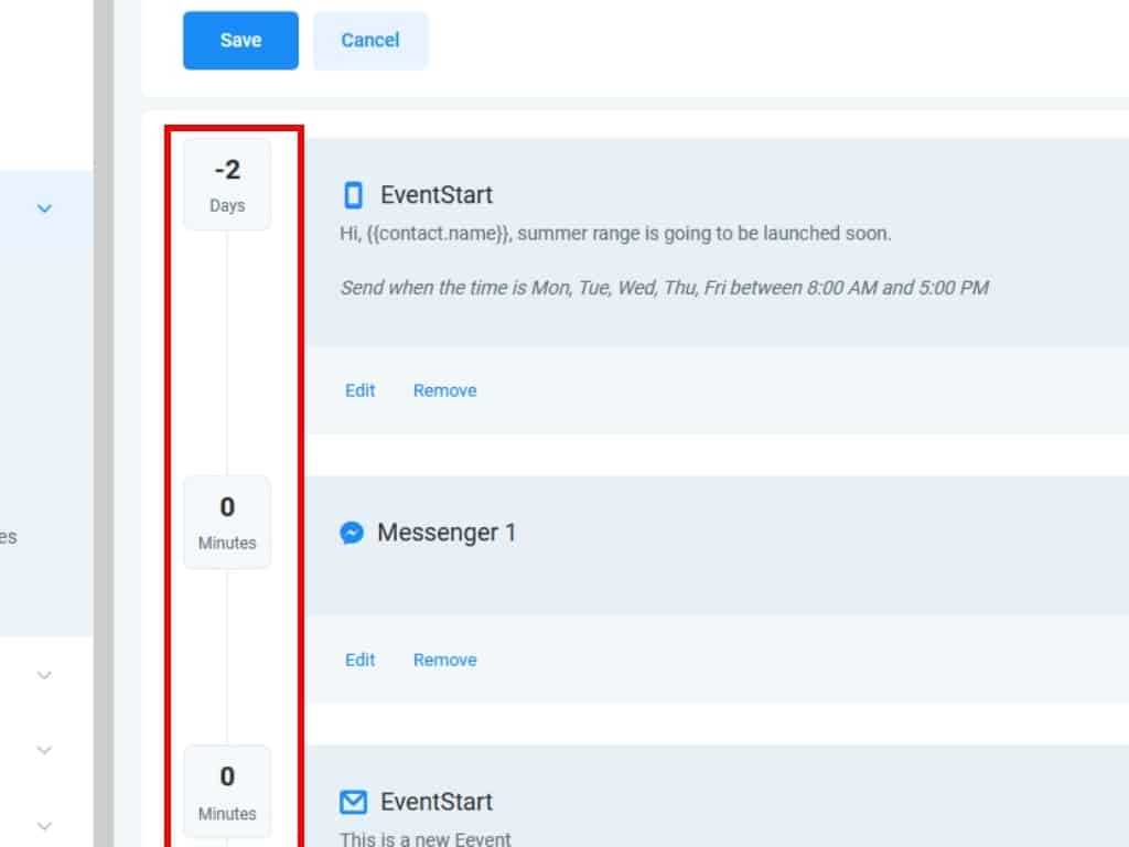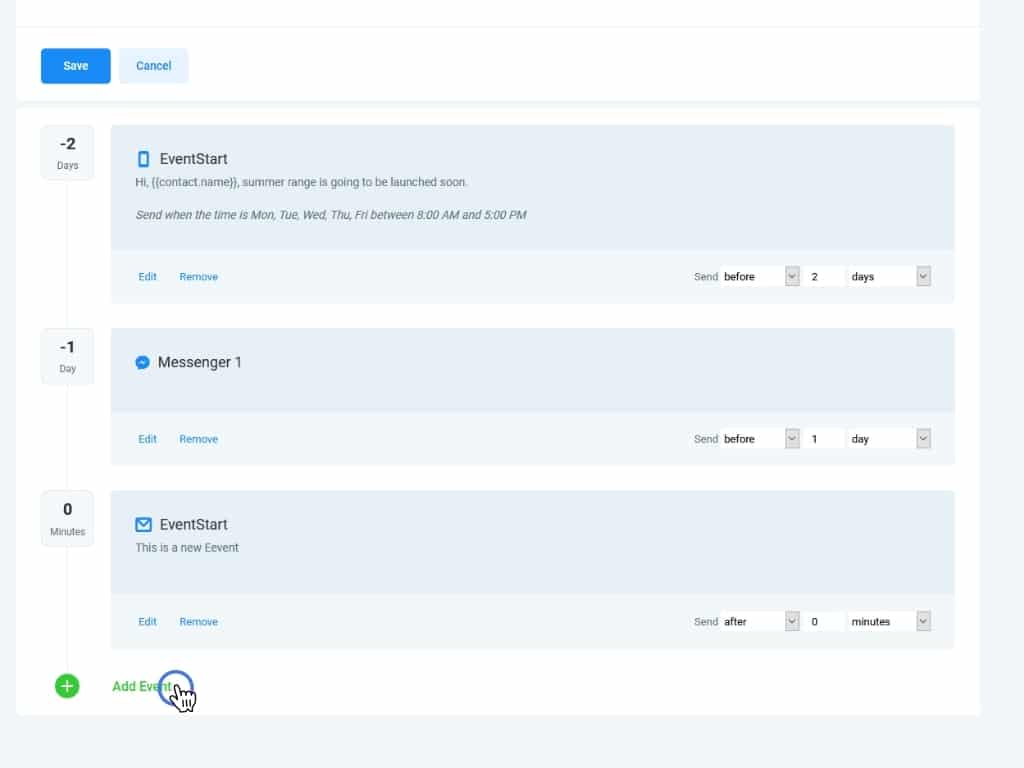 A Messenger event works in exactly the same way as an SMS event. The only difference is that Messenger will be used to send the message. Keep in mind that you'll need to have an integrated Facebook account for Messenger events to work properly.
