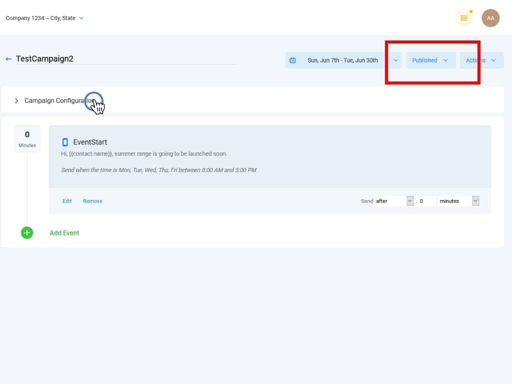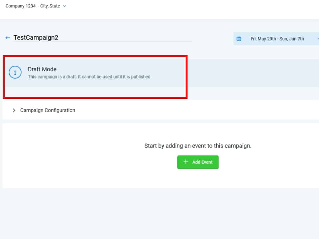 When we return to the main Campaign page, you can see the first event has been added. Now, the Campaign can be published.