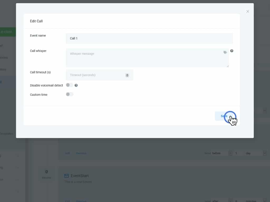 Fill the fields and then click Save to create your call event and add it to the Campaign page.