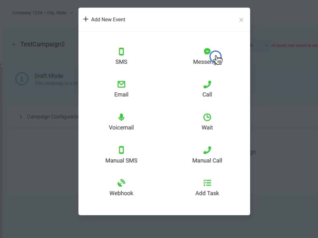 We've already added an SMS event to our Campaign, so now let's add a Facebook messenger event.
