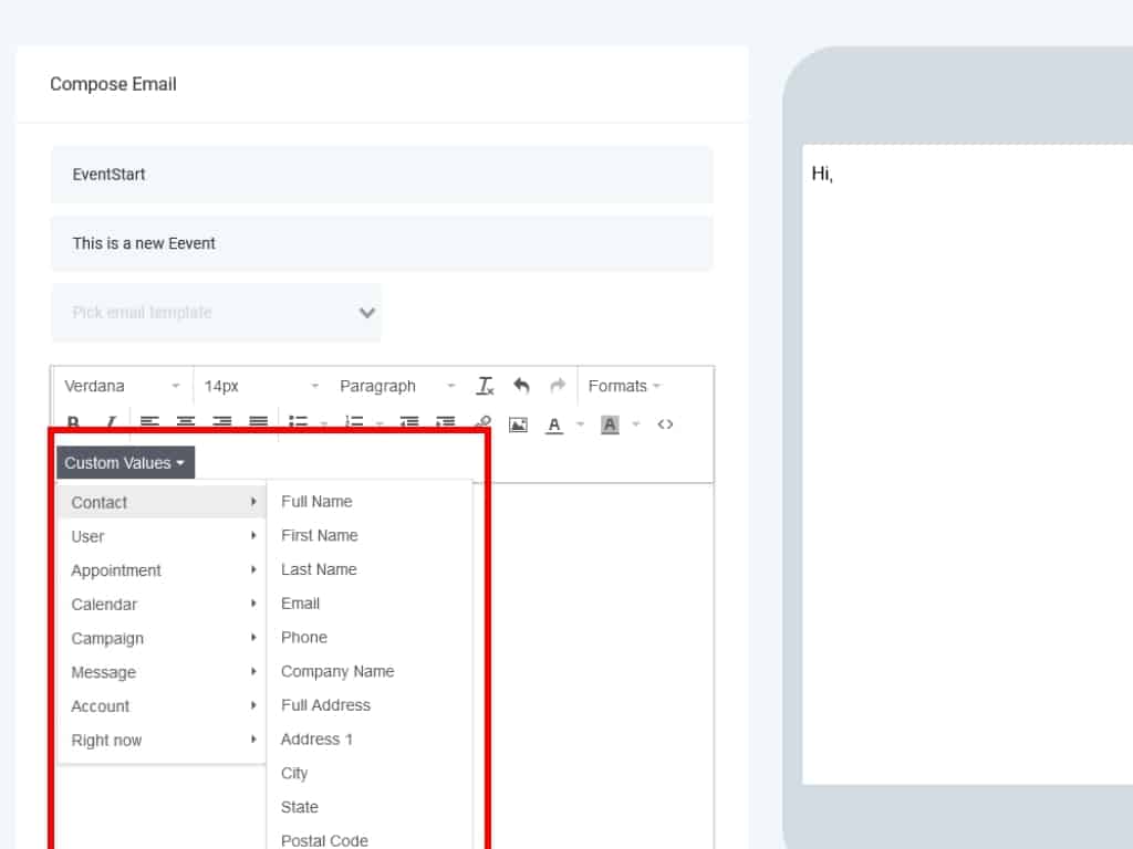 The editor for email events has more formatting options than SMS or Messenger events. And you can also add Custom values into your email text. Write your message in the text editor, and it will appear in the emulator to the right.