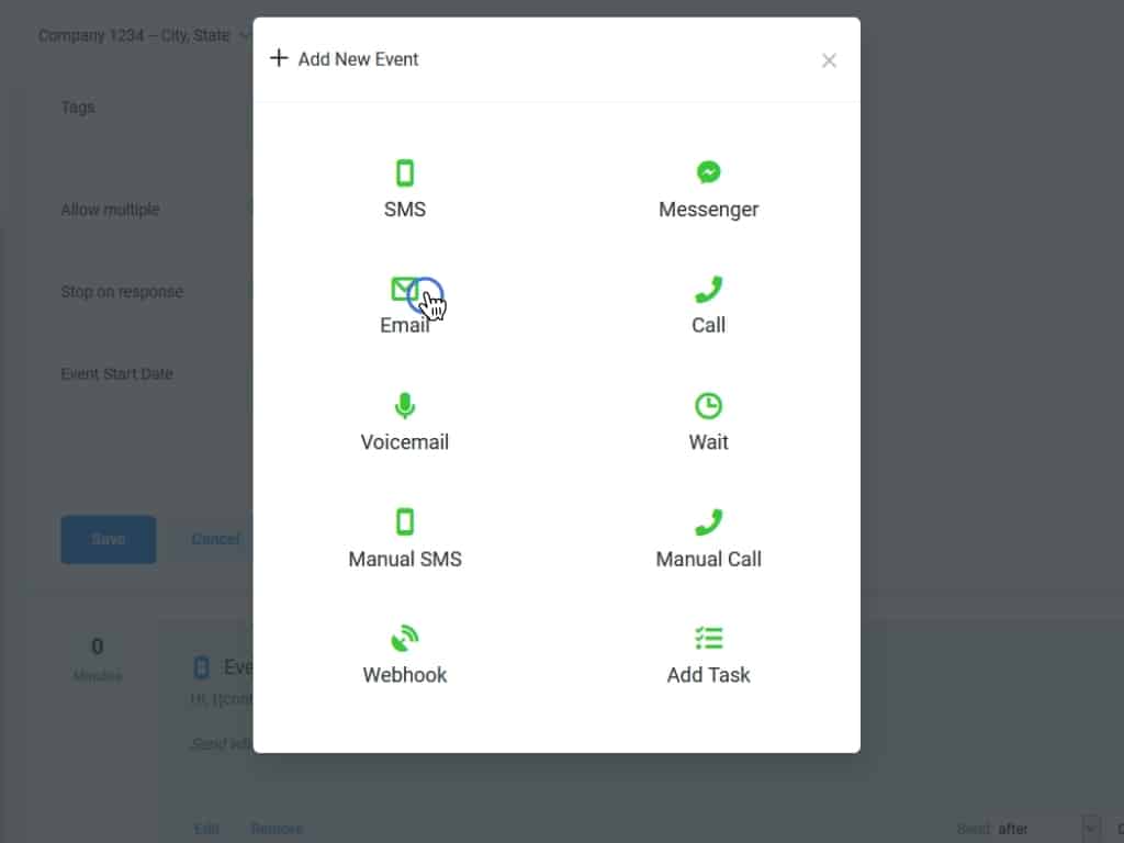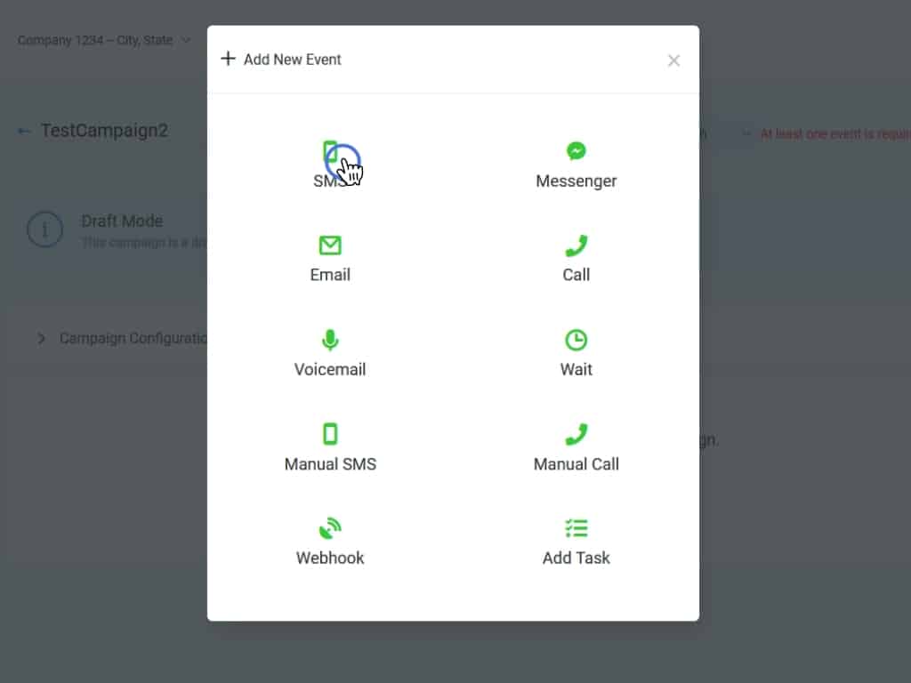 This will open a popup that shows you all the different types of events you can create. Let's start with an SMS event.