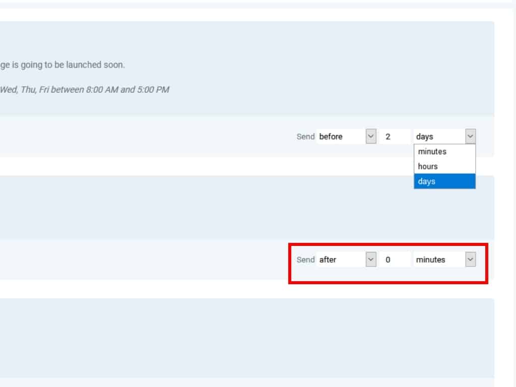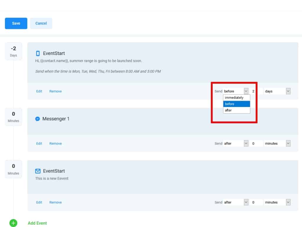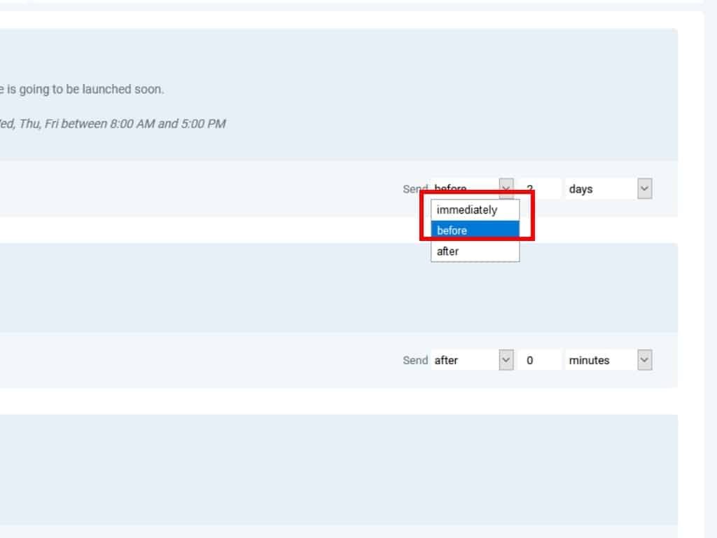 For each event, you'll find a drop-down with sending options in the bottom right of the event bar. The 3 available options are Immediately, Before, and After.