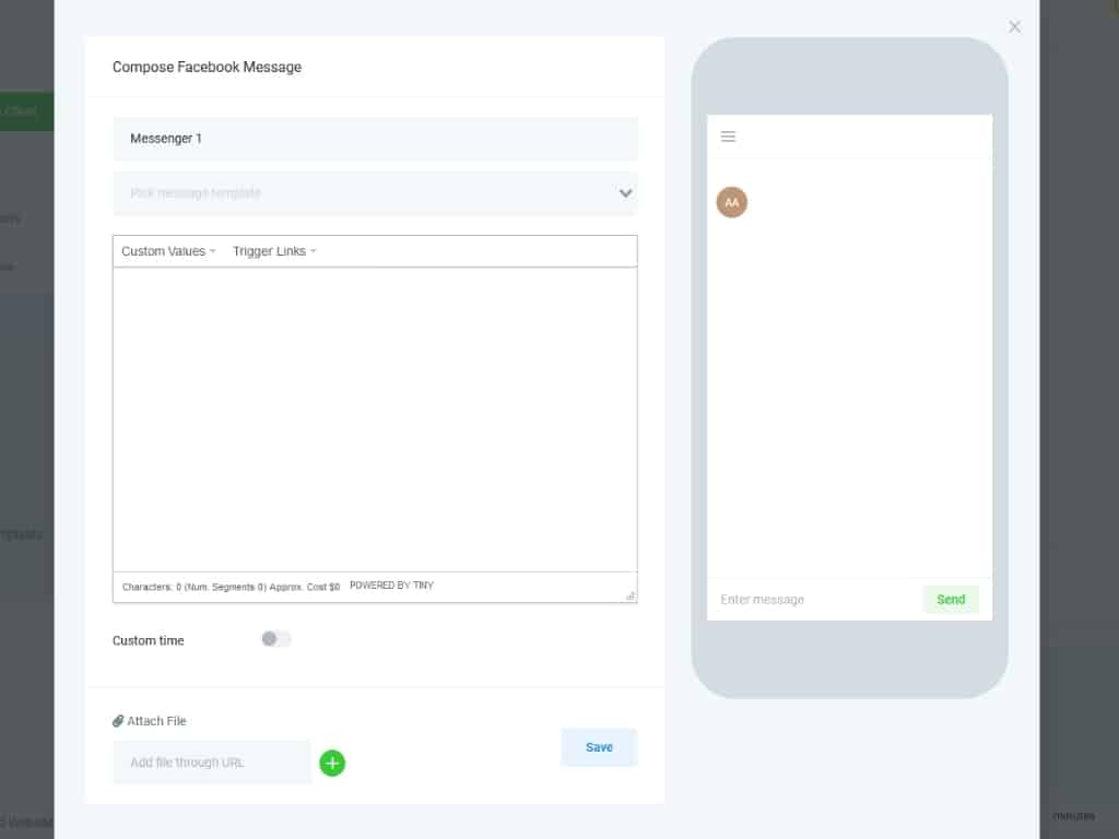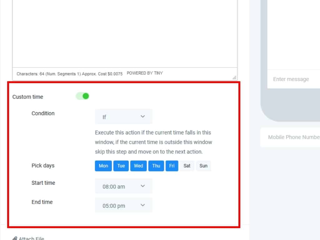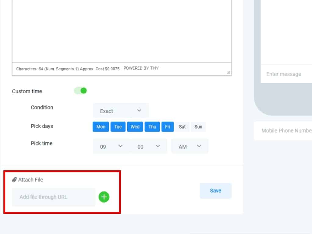 Below the custom time area, you can attach a file to your SMS, or link a file URL.