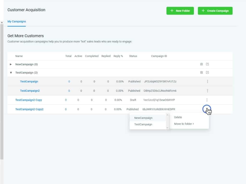Clicking the 3 vertical dots will let you either delete the Campaign or move it to another folder.