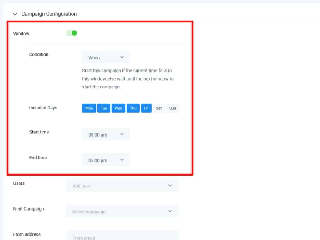 Below the window toggle, you can assign the Campaign to other system users. Multiple users can be added to a Campaign with this feature.