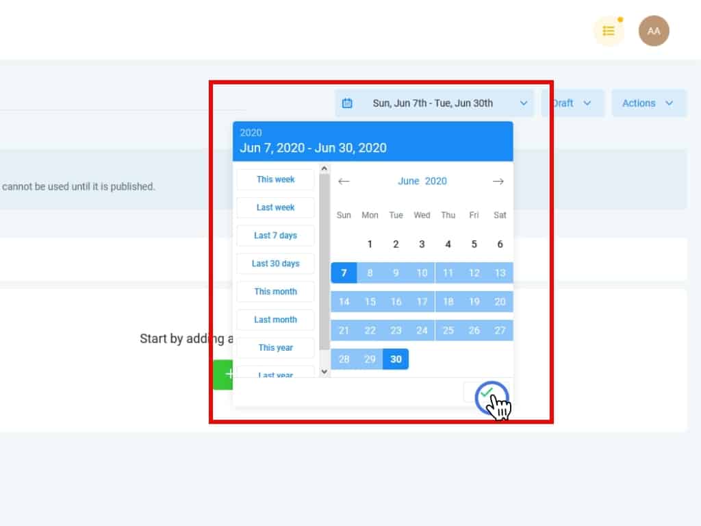 Select the starting and ending dates for your range and then click the checkbox to save it.