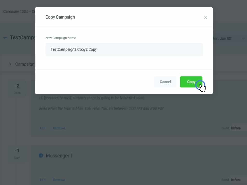 A window will open to give the copied Campaign a name. Then, click Copy. This will bring you back to the Campaigns section of your CRM.