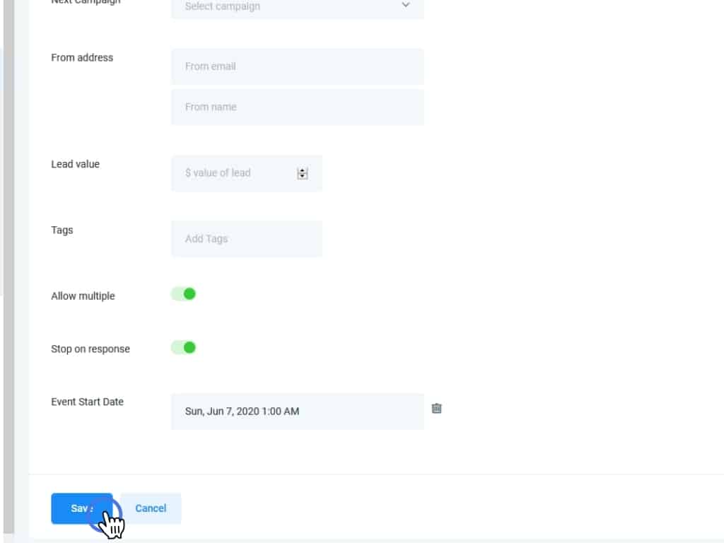 Moving down, the Allow multiple toggle, if enabled, means that leads can be enrolled in this Campaign and others at the same time. On the other hand, if the allow multiple toggle is disabled, you will not be able to add contacts that are currently in another Campaign.