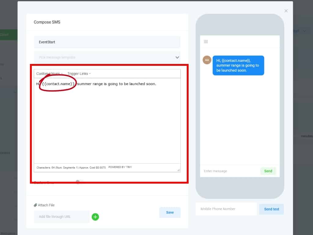 In addition to standard text, you can also add custom values like the contact's Full Name or City into your message. Here, I've added some simple text and inserted a custom value for Contact Name. When the SMS is sent, "contact name" will be replaced by the contact's actual name.