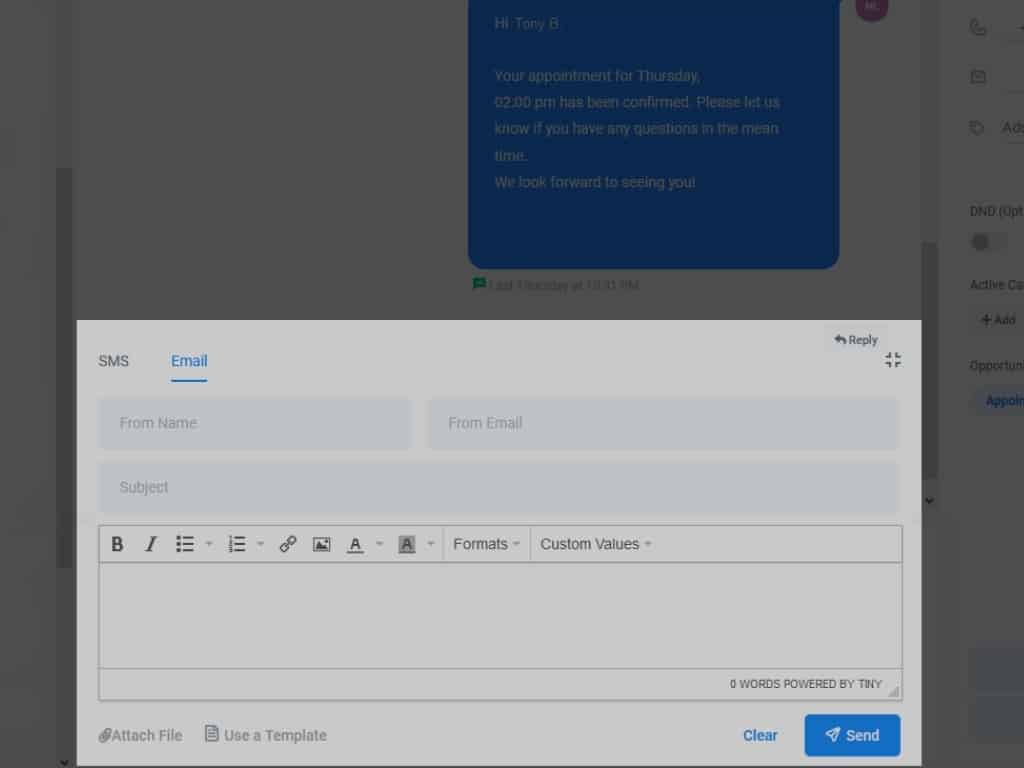 As with SMS, you can also attach a file to an email, or use a previously-created email template.