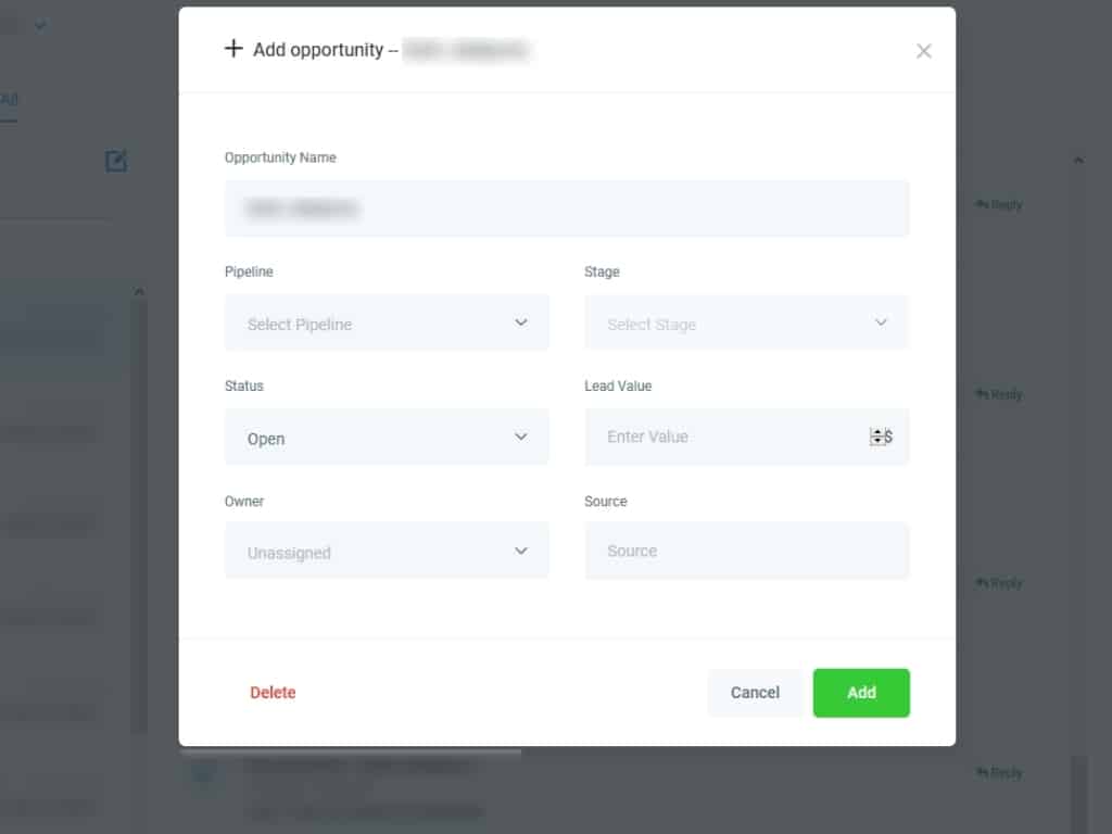 A pop-up opens with quick access to create the contact's new opportunity. You can edit the pipeline, stage, status, lead value, or other variables. I'll click the X in the upper right to go back to the contact details.