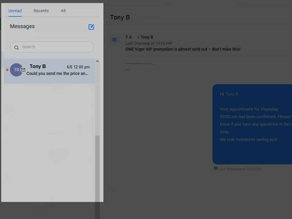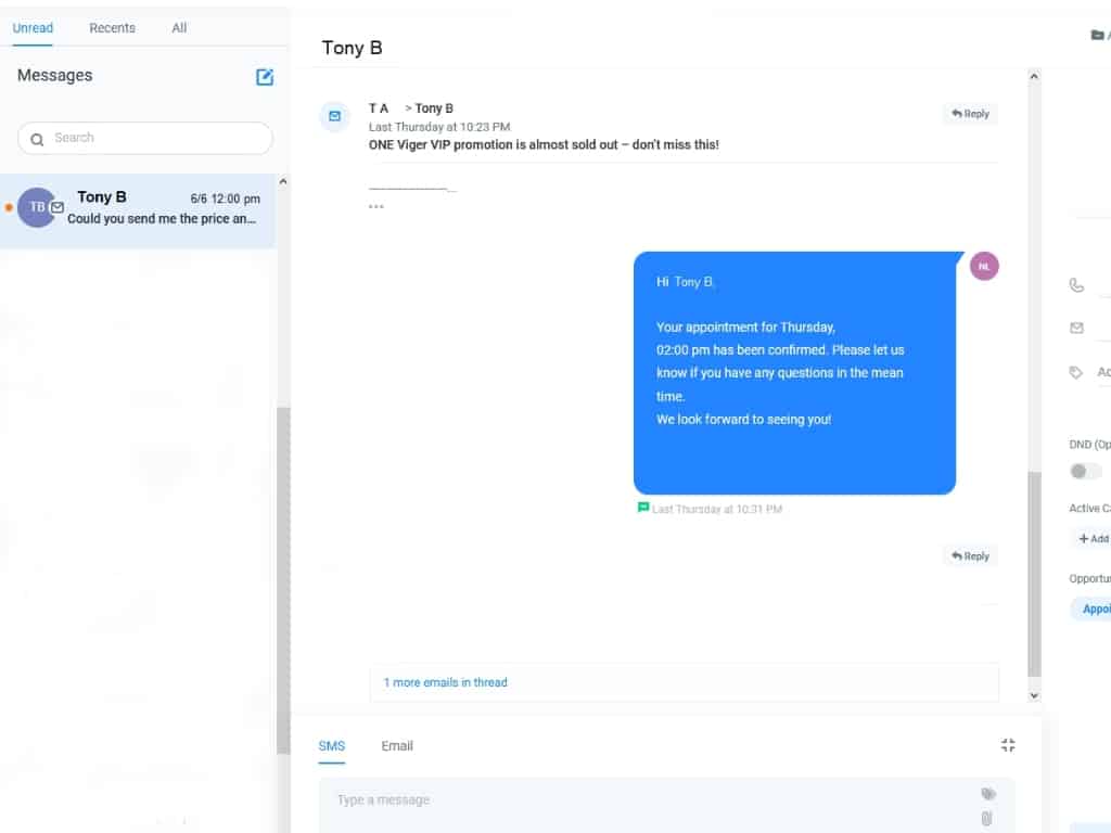 When you click a message from the left section, it'll be expanded in the center area. Here, you'll have a threaded view that includes all email and SMS messages to and from the contact.