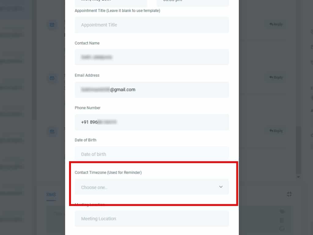 Scrolling down, you have more options. If your contact is in a different time zone than you, make sure to set the contact's time zone here. This will ensure they get an appointment reminder at the right time.