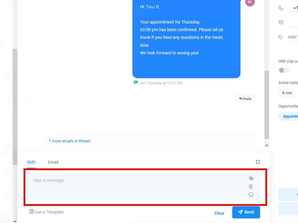 Below the message thread, you'll find an area for sending replies. When sending a message to the contact, you can click the SMS or email button to choose your preferred delivery method.