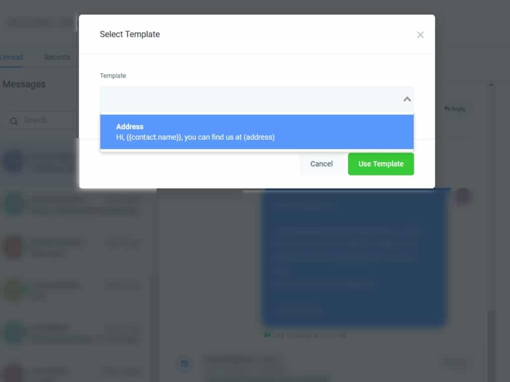 This opens a pop-up with a list of available templates. I previously created the Address template, so it appears here. When you select the template you want and click Use Template, the template text is automatically inserted into the SMS editor.