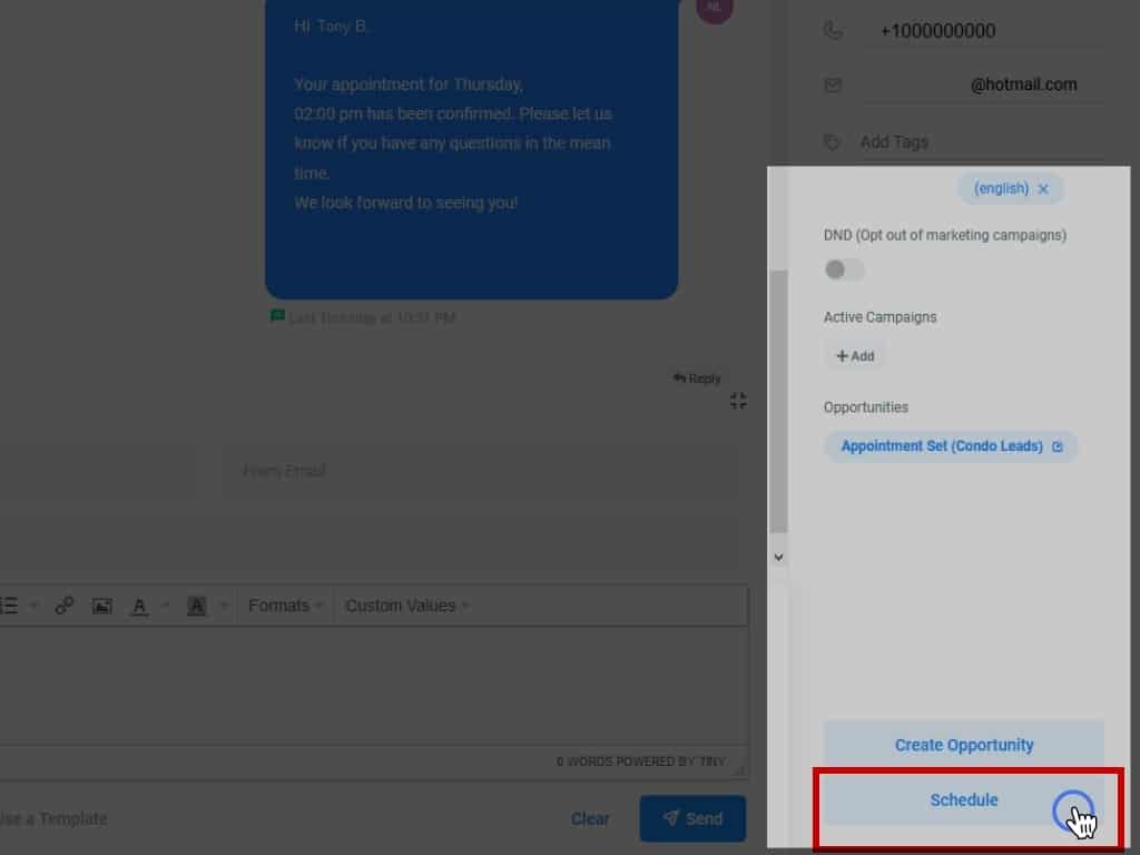 The last button in the contact details section is Schedule. I'll click it to schedule an appointment for the contact.