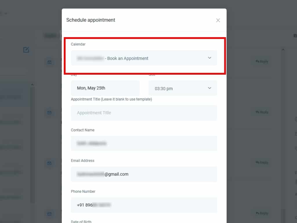 In the pop-up that opens, the first field you see is Calendar. If you're using more than one calendar in your CRM, you'll need to select which calendar you want the new appointment to appear on.