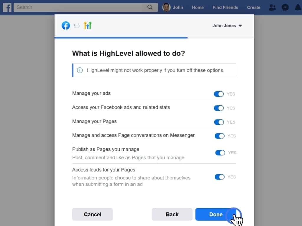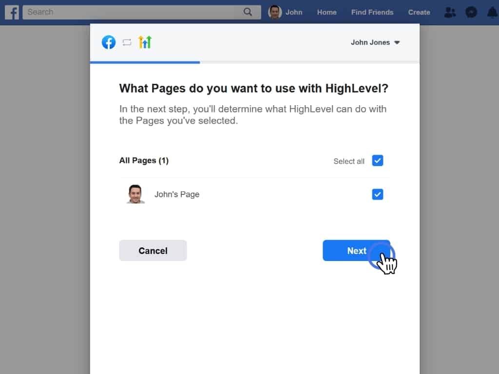I've already created a test Facebook account with the name John Jones as well as test pages. In this example, John's Page is the only option, but you can also connect multiple Facebook pages if desired.