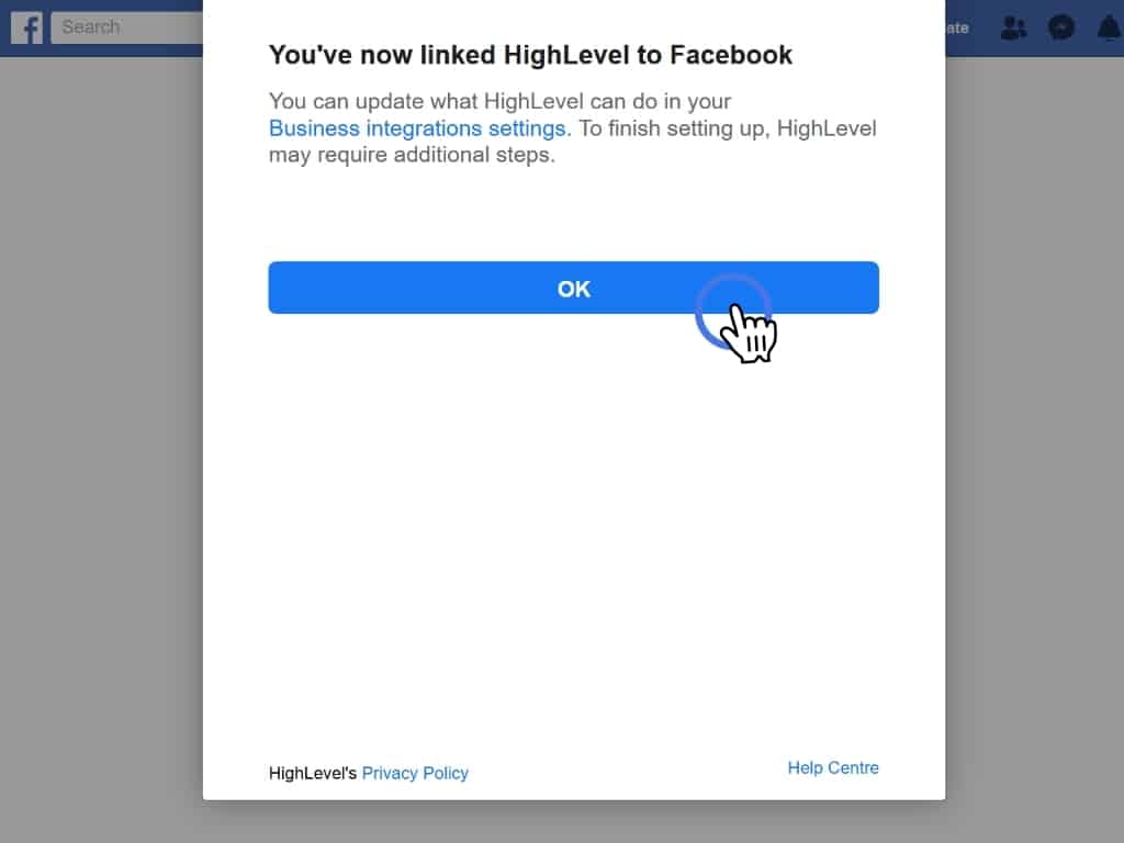 This will open a pop-up to confirm your identity. Click Continue, and then select the page you want to connect to your CRM.