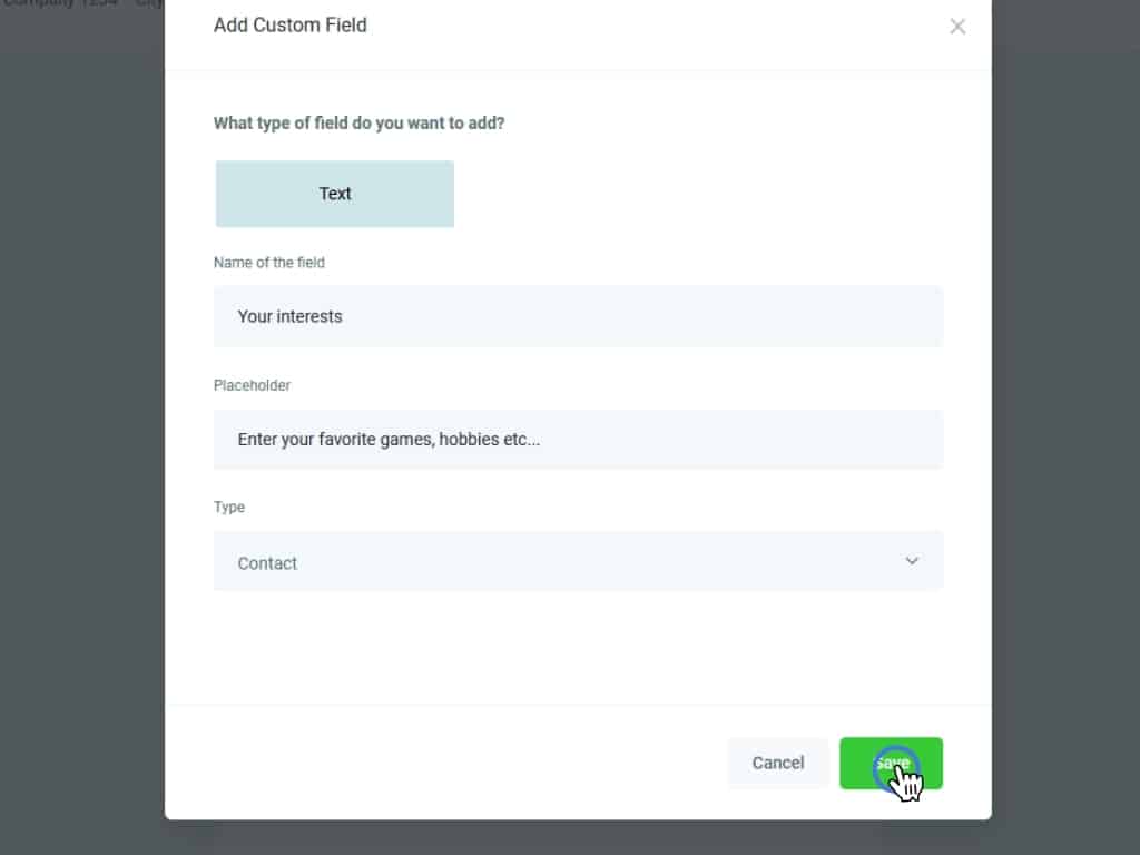 Leave the type as "contact" and click Save to create your custom field.