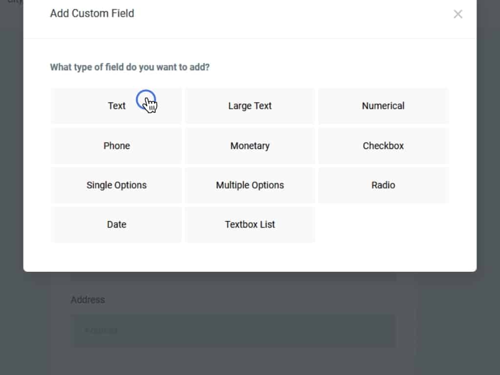 This opens a pop-up with the different types of custom fields you can create. For this example, we'll make a text field. Click Text now.