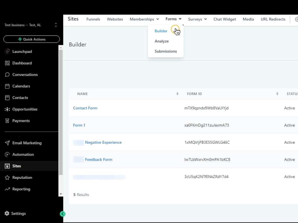 To start, let’s click Sites in the left menu, and then click Forms in the top menu.