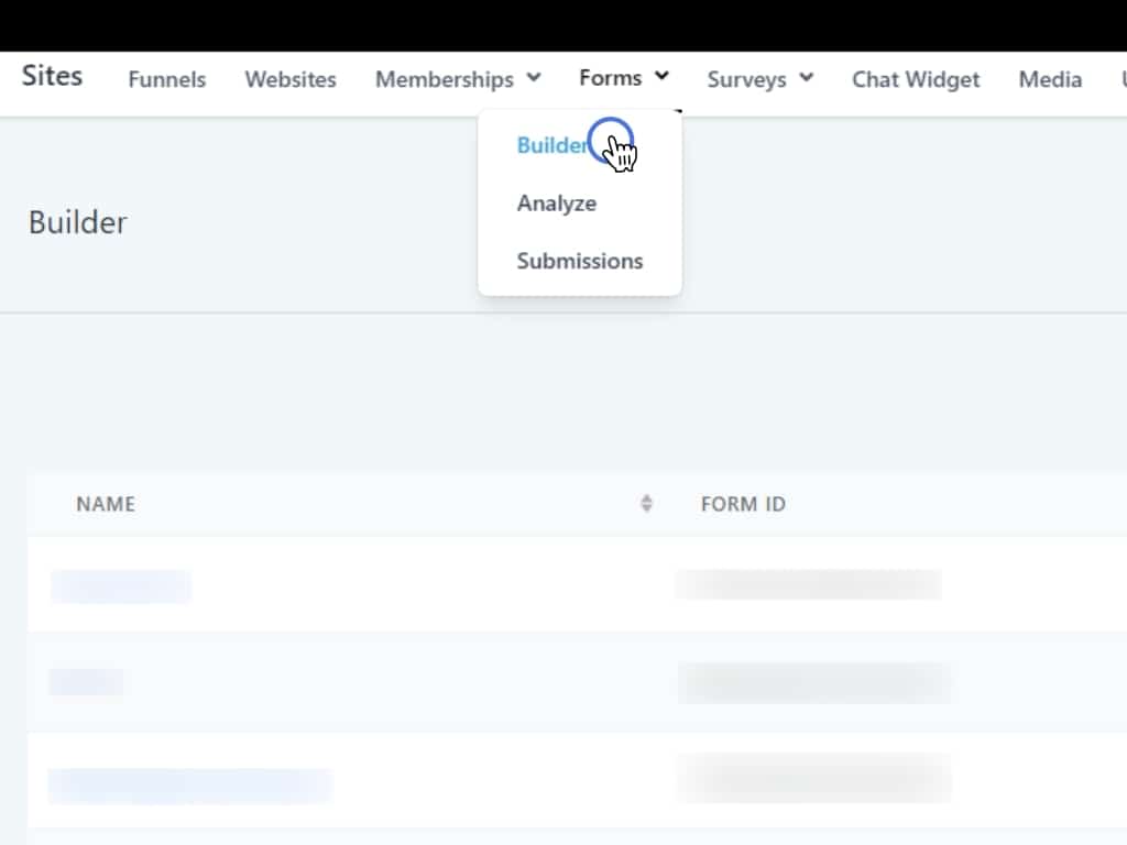 To start, let’s click Email Marketing on the left menu, and then choose Builder from the Forms dropdown.