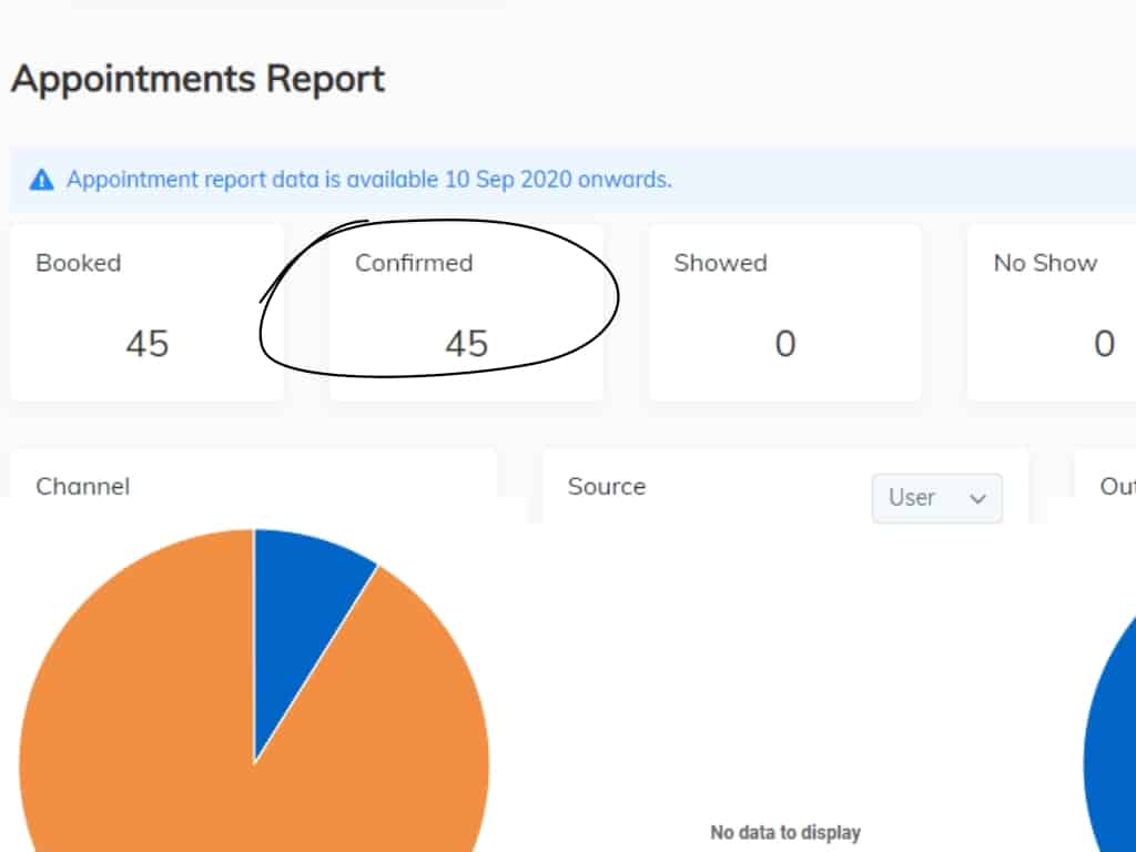 Once you’ve set your filters, you can view information around appointments booked within that timeframe, appointments confirmed, appointments where the client actually showed up, no shows, and other statistics based on appointment status.