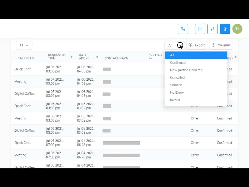 You can toggle between the status of the appointments, export the list, and choose the layout of the columns that you want to see visually.
