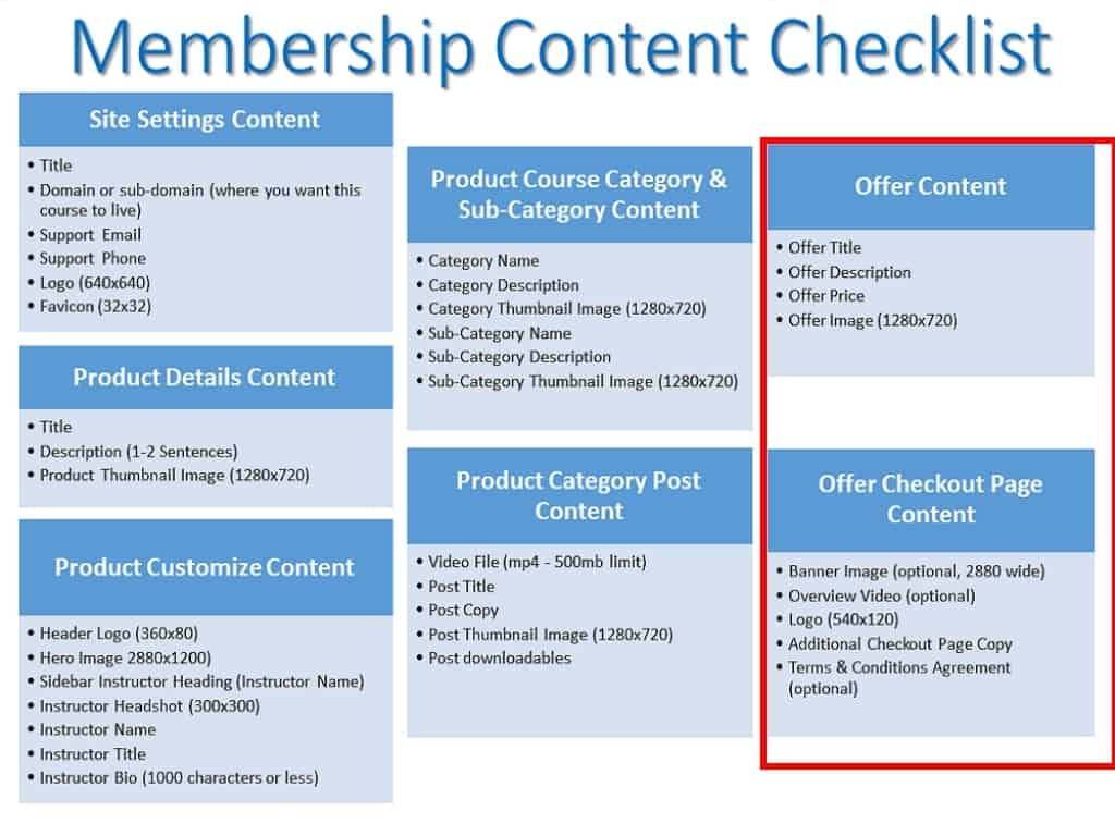 In this article, I'm going to expand on that concept and show you how to develop an offer for your membership site. As you can see, this will cover the last two steps on our checklist, Offer Content, and Offer Checkout Page Content.