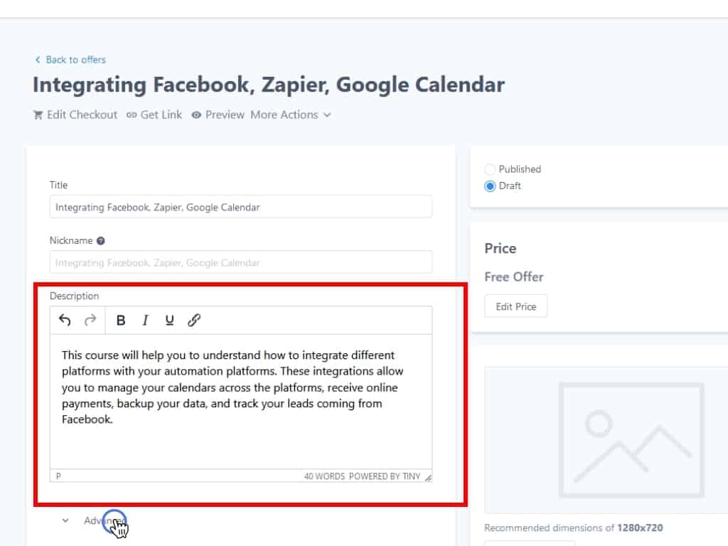 In the description field, you can use the editor to create your description. We've already written our description, so we'll copy it from our text file and paste it here.