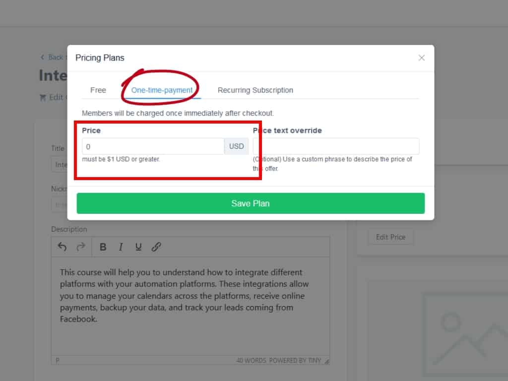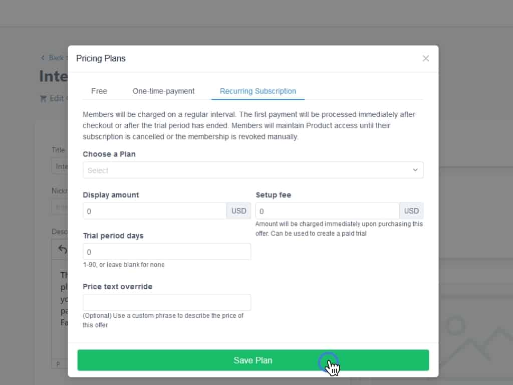 If you want to charge for your product, there are two types of payments you can enable from the tabs at the top of the window: a one-time payment or a recurring subscription. As in the initial offer setup, you can set your price and currency in this window