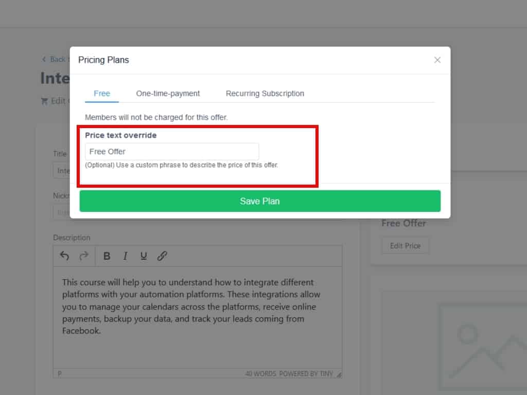 This opens a new window. To change the default free offer text, simply modify the text in the Price text override field.