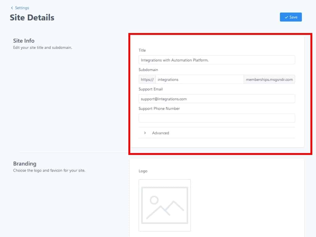 And then paste it into the fields on the site details page. We're using dummy data now, but when you create your membership site, you'll need to provide the actual information. We're going to leave the support phone number field blank for now.