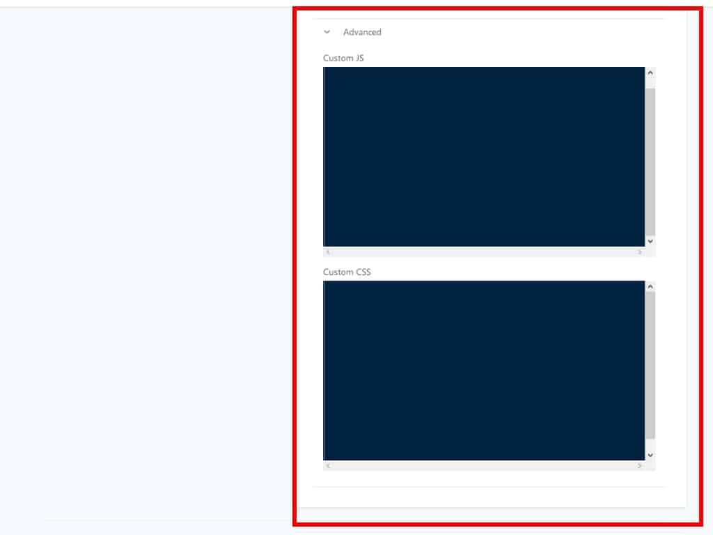 This opens two text boxes, one for Custom JavaScript, and one for Custom CSS. If you're using custom JavaScript or CSS, the code would be added here.
