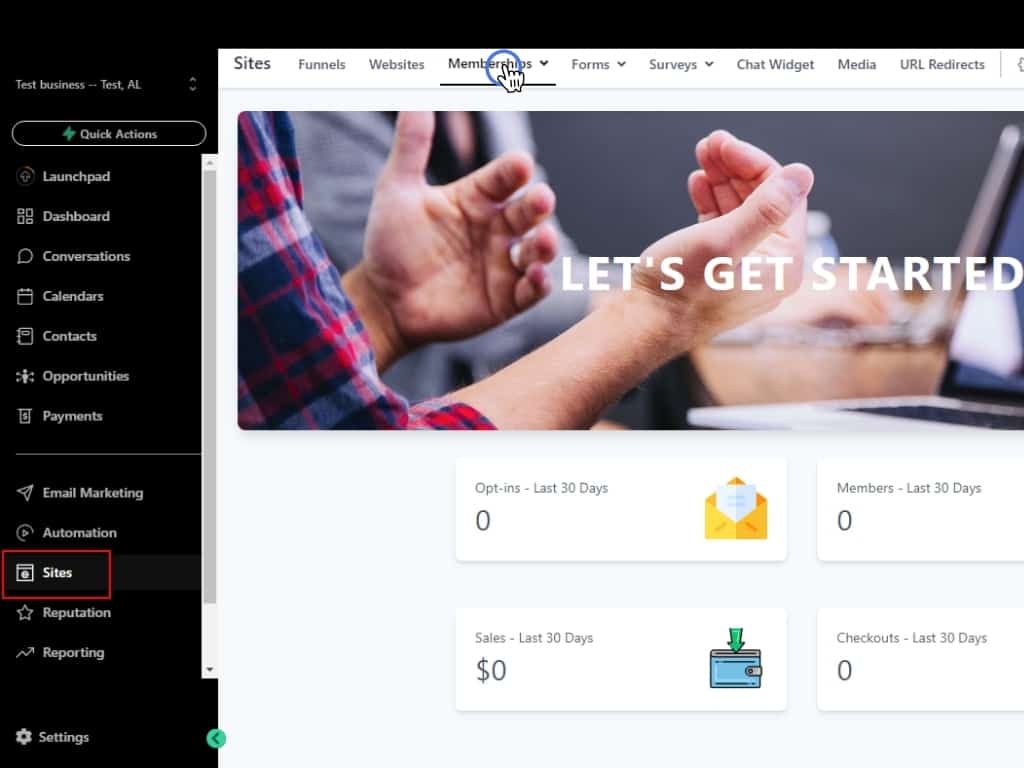 To start, let's click Sites on the left menu. and then click Memberships on the top menu.