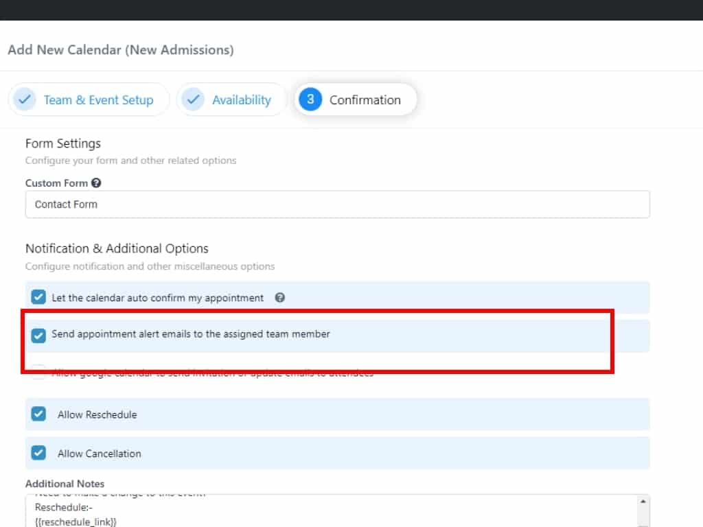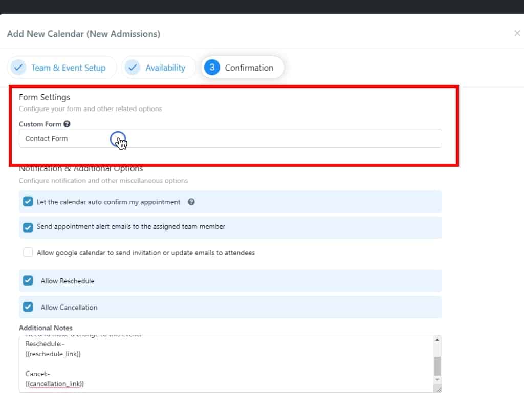 In the Additional notes field, the custom links related to rescheduling and cancellation are entered. You can also add custom messages in this field.