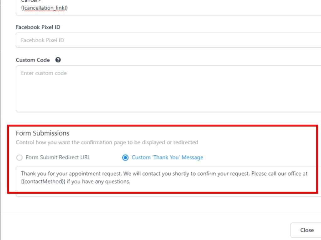 Finally, at the bottom of the tab, form submission gives you the option to control what happens when a new appointment is booked. You can either redirect them to a URL or display a custom Thank You message.
