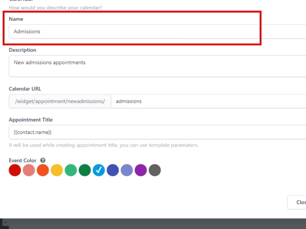 Below the appointment distribution section, we have a field for the new calendar's name. We'll call our calendar, Admissions. Add your calendar’s name.