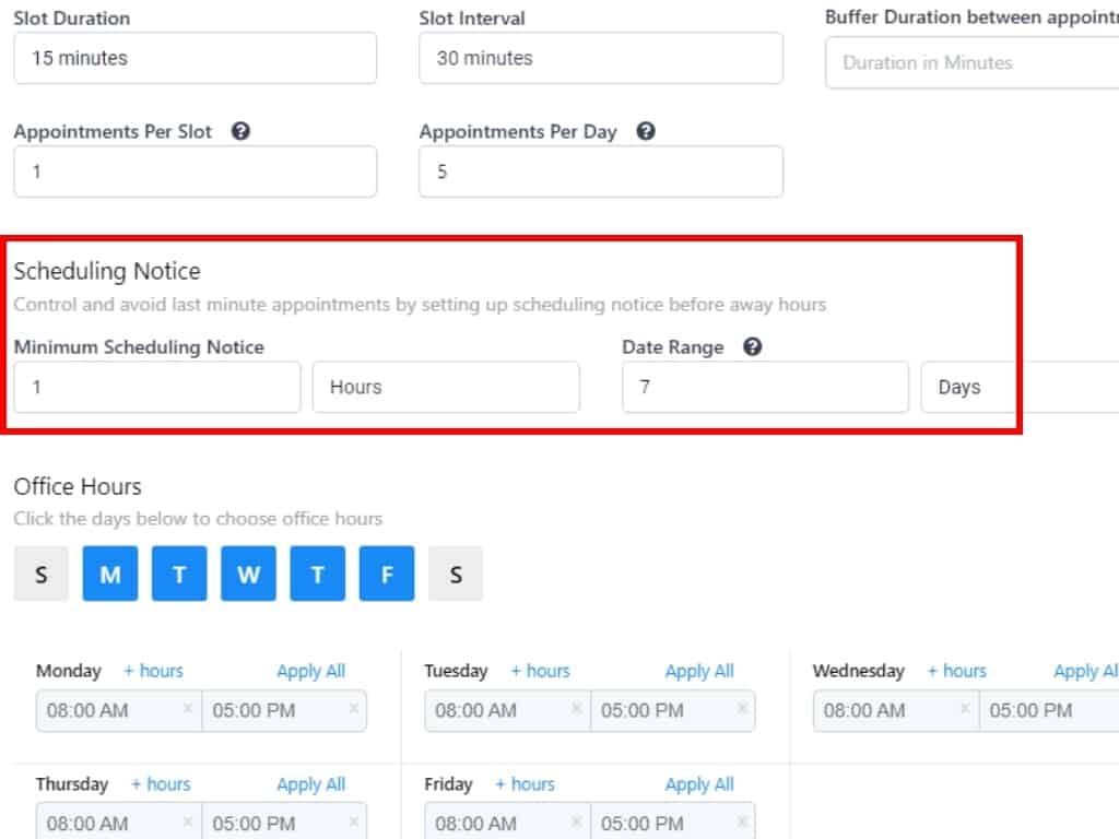 Below the appointment slot settings is an area for Scheduling Notice. By requiring advance notice, you can avoid last-minute appointments with no time to prepare.