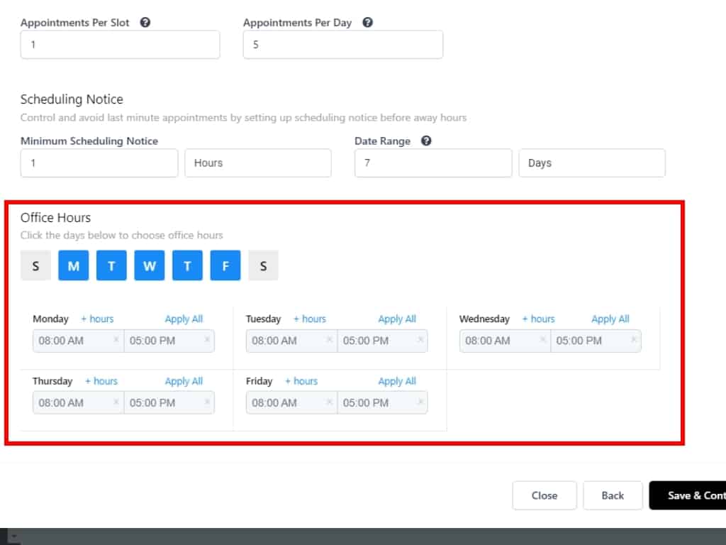 Once your Office Hours are complete, click Save & Continue to move on to the final tab.