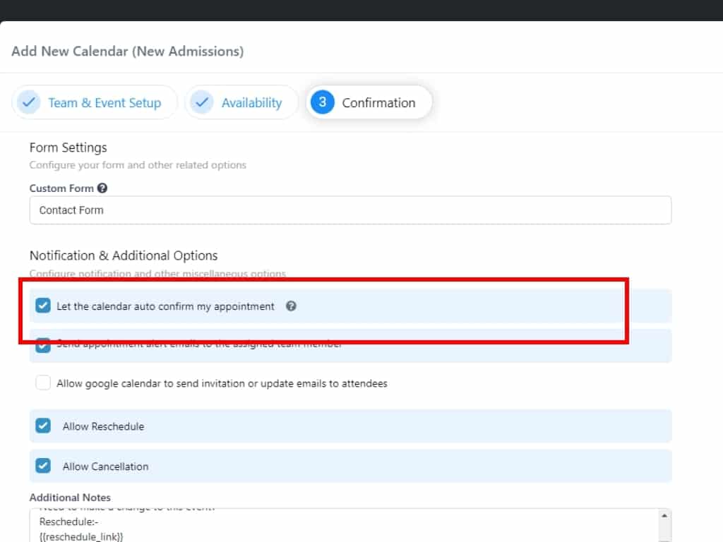 The first option is auto-confirmation for each appointment. If you check this box, any appointments made in this calendar will automatically become confirmed. If left unchecked, you'll need to manually confirm each appointment.