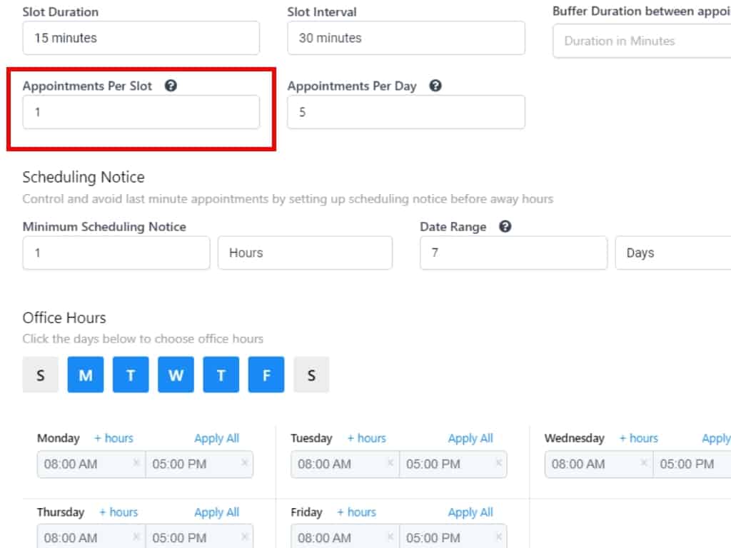 For team calendars, this next field is more accurately described as appointments per team member per slot. A setting of 1 means each team member can have 1 appointment per slot.