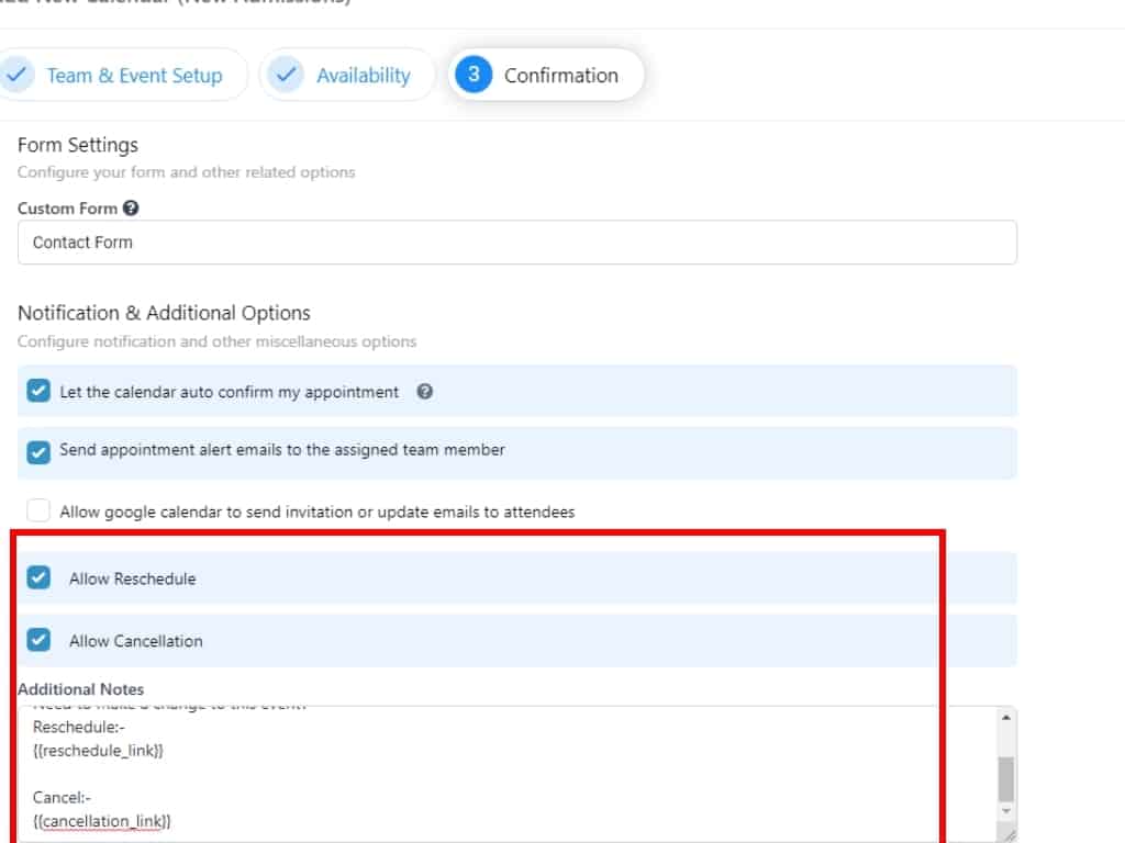 The next 2 options are Allow Rescheduling and Allow Cancellation. As you might have guessed, these options allow your appointment bookers to reschedule or cancel their appointment.