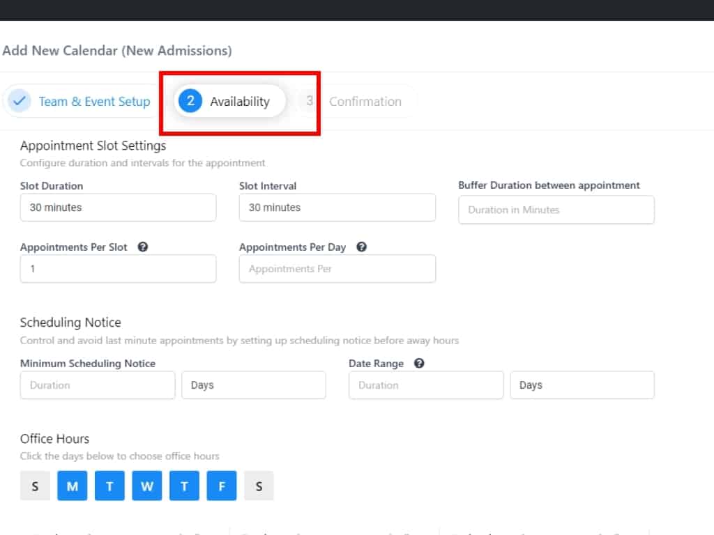 The second tab is Availability, where you’ll set up your scheduling parameters.