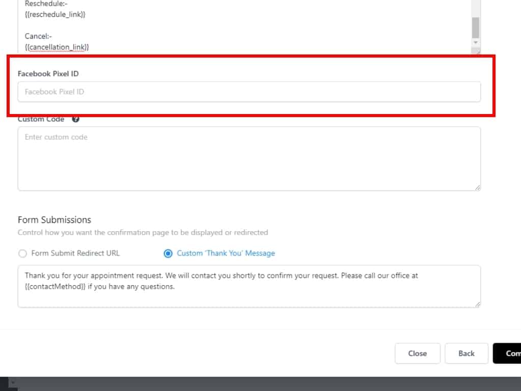The next area is a field to add your Facebook pixel ID. This lets you create conversions in Facebook Business each time a new appointment is booked.